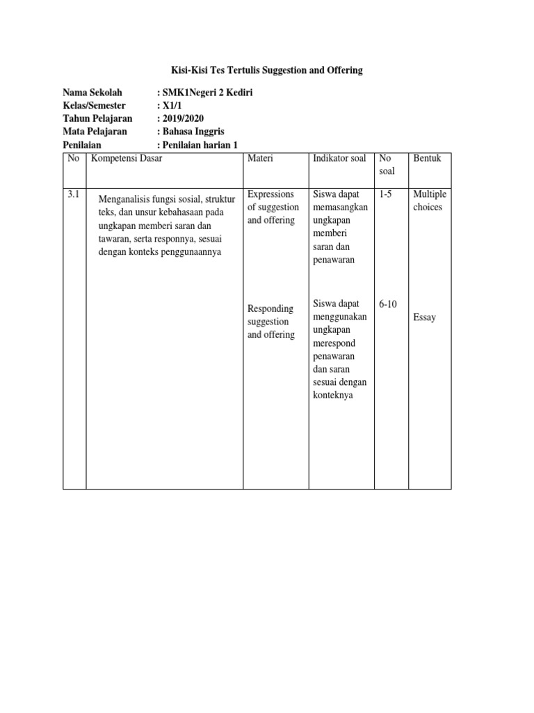 Soal Suggestion And Offer Kelas 11 / Penjelasan Tentang Suggestions Dan Offers Lengkap Dengan Contoh Kalimatnya Pendidikan Bahasa Inggris - Offer and suggestion online test 2019/2020.. Kompetensi inti ki 1 : Jika berkenan atau mencari referensi lain. Berikut indoint memberikan soal uts bahasa inggris kelas 11 sma/ma. Mostly the riders badly end up in mess. He offered the jackal to live close to him and also promised to give food the lion whenever he.